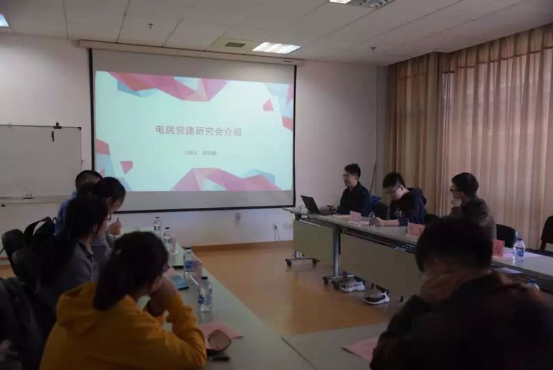 电院党建研究会主席陈宇超同学进行电院党建研究会介绍。陈宇超同学介绍了党建研究会的发展历史、现行组织架构和服务功能,以及党建研究会的特色活动。另外,方焯同学作为电院本科生信安党支部组织委员向大家介绍了电院本科生党支部的建设情况。