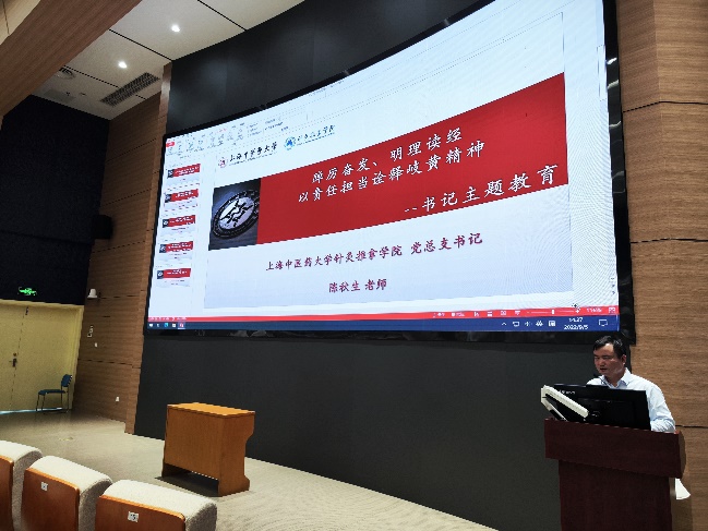 陈秋生作了题为“踔厉奋发、明理读经-以责任担当诠释岐黄精神”的主题教育,向全体新生提出了两个“定”-定好方向、定好目标。他殷切希望同学们在校学习期间,要认真践行“明理-读经-练功”,求真理、悟道理、明事理,为守正创新、传承发展中医药事业,为服务人民健康福祉练好内功。